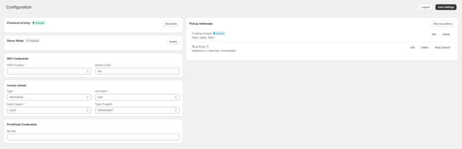 7. On the configuration page will you need to input the details which will be sent to DSV, when using the DSV Shopify app.
