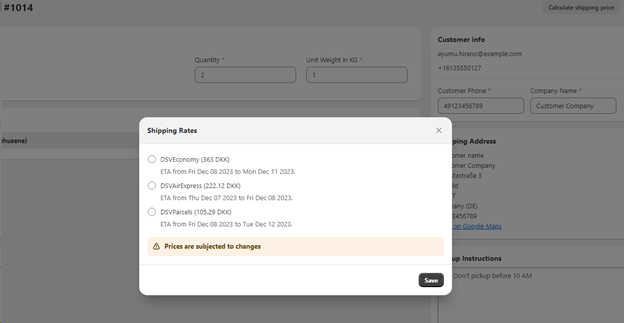 4. If the order doesn`t have a shipping method supported by DSV you will have to click on the “Calculate shipping prices” button. Doing so will provide you with the other available options for shipping the order and request you to select preferred shipping option.